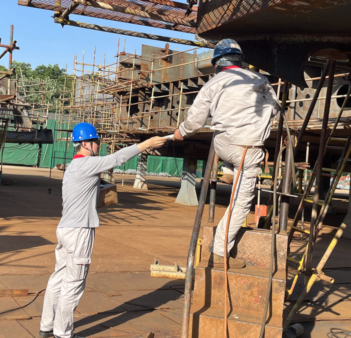 重吊船2#船自8月2日上船臺定位GB02總段,目前已經(jīng)合攏總段4只,總組完工7只,所有工作沒有因為高溫而暫停,進度沒有因為環(huán)境而滯后。同系列船,3#船和2#船的硬件設(shè)施不一樣,搭載方案不同,3#船采用小組段搭載,強化前期策劃,克服高溫惡劣天氣科學(xué)連續(xù)施工,底層合攏工作基本完成,下一步進行全船成形攻堅。